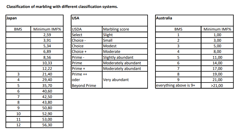 Customers naturally want to know what marbling score the meat they are about to buy has to offer. A BMS (Beef Marbling Score) of 8 or 9 is often quoted - but what grading system is this statement based on?