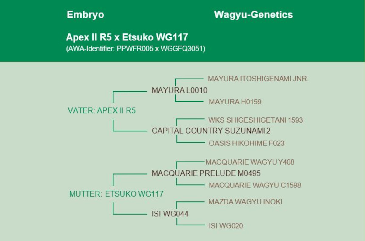Capital Country Apex II R5 stammt von Mayura L10 ab, einem der Top-Bullen der letzten Jahre in Australien mit vielen Nachkommen, die seine sehr guten Zuchtwerte weitgehend bestätigen. Über die Mutterseite kommen bei dem Bullen World K’s Shigeshigetani (Marmorierung!) und Itoshigefuji (Milch/Gewicht) ins Pedigree.