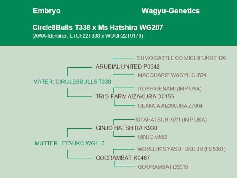 Der Vater dieser Anpaarung ist der Bulle Circle8Bulls T338 – der 8. Beste Sohn aus mehr als 2.000 männlichen Nachkommen (Stand Januar 2026). Er hat einen BFI von 703 und herausragende Werte bei der Marmorierung (+3,9; Durchschnitt +1,4) sowie bei der Marmorierungsfeinheit (+0,69; Durchschnitt + 0,24). Gewicht und RibEye sind auch sehr gut ausgebildet.