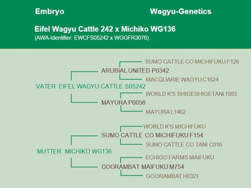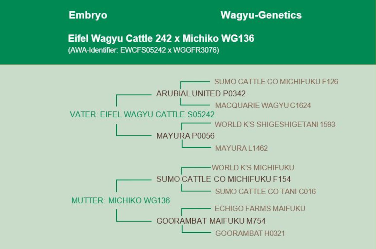 Der Arubial United 342-Sohn von Eifel Wagyu bewegt sich bei allen Indizes im Top1%-Segment! Ein Bulle mit herausragenden Zuchtmerkmalen. Als sogenannter Allrounder hat er Milch, ein super Karkassengewicht und eine sehr hohe Marmorierung – beinahe 3 x so hoch wie der Durchschnitt!