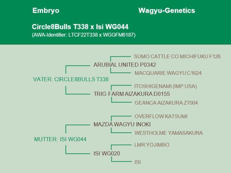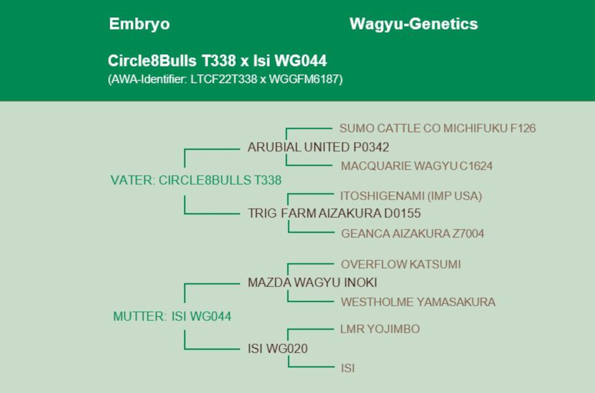Die Mutter Isi WG044 hat bereits vielfach gezeigt, dass sie Zuchtfortschritt produziert. Dies gilt insbesondere für den Top-Bullen Mayuko! Sie hat mit Mazda Wagyu Inoki einen extrem seltenen Vater, die noch sehr viel Original-Genetik ganz nah im Pedigree hat.