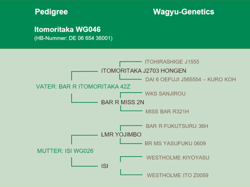 To this picture one does not need to say actually many words - this bull is a real great guy - Itomoritaka WG046 was licensed with 8-8-8. Very well muscled! He reaches VA in the SCD test and 5 in tenderness - he is free of known genetic disorders!