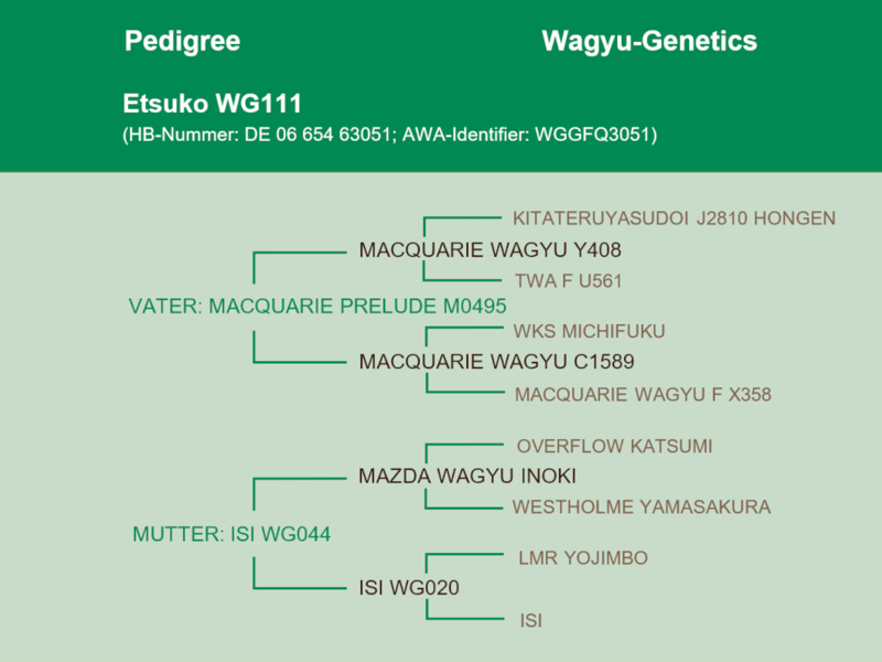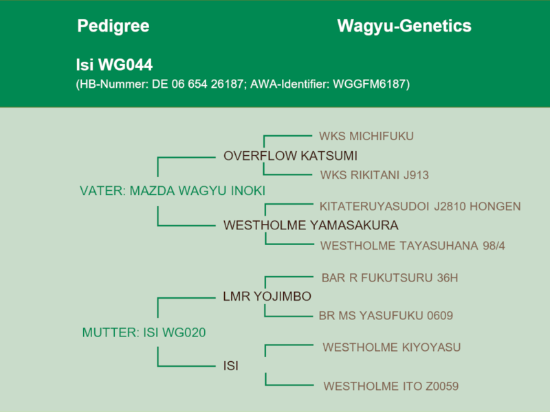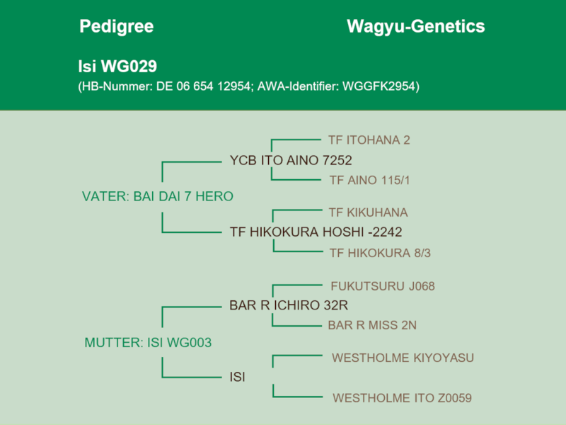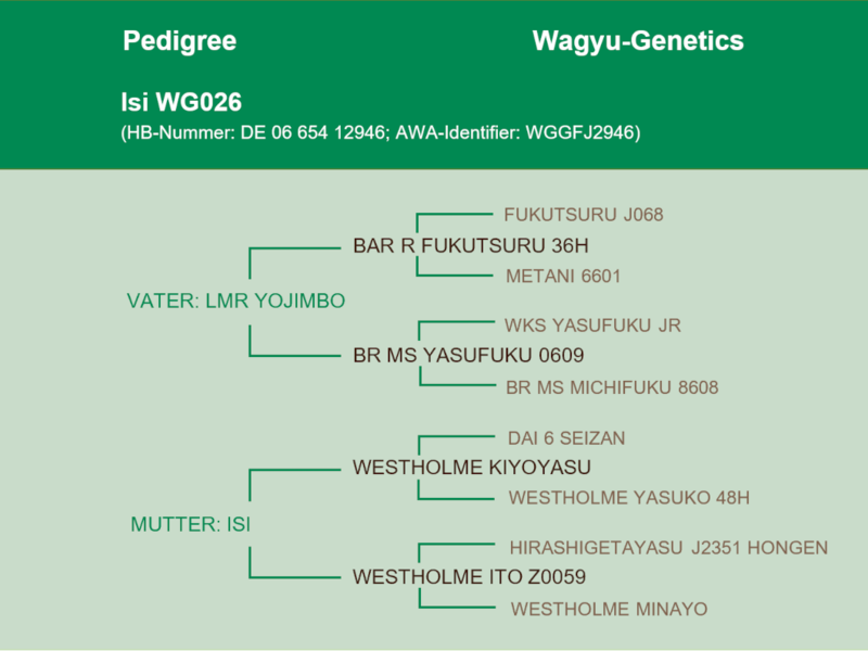 Isi WG026 ist 2013 geboren. Sie ist frei von allen bekannten genetischen Besonderheiten. Auf der Mutterseite ist sehr alte und originale Westholme-Genetik vorhanden. Im Pedigree ist der extrem seltene Dai 6 Seizan zu finden, der ebenso wie Hirashigetayasu für Größe steht - aber auch zweimal Kitateruyasudoi, berühmt für die Fettzusammensetzung, Marmorierung und Feinheit der Marmorierung. Näher an direkte Genetik von Japan geht kaum!