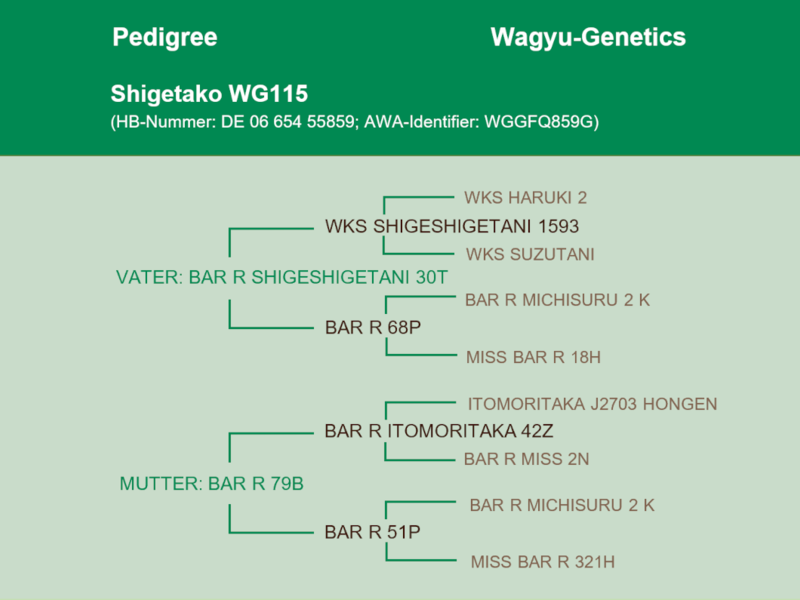 Shigetako hat Jerry Reeves Ausnahmebullen BAR R Shigeshigetani 30T als direkten Vater. Er hat laut dem Wagyu Sire Directory aus den USA das zweitgrößte RibEye aller dort registrierten Bullen!