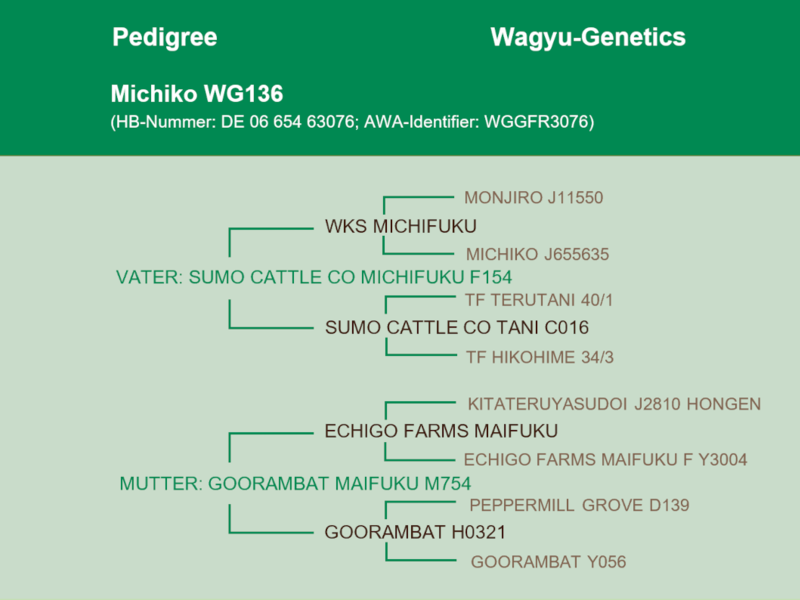 Michikos Vater ist Sumo Cattle Co Michifuku F154, ein im Jahr 2010 geborener Bulle, der über nahezu 500 registrierte Nachkommen verfügt und mit einer sehr großen Wahrscheinlichkeit ein hohes Karkassengewicht sowie Marmorierung und deren Feinheit vererbt - weit über das normale Maß hinaus!