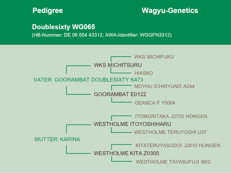 Der Vater ist Doublesixty K473 aus der Zucht von Goorambat in Australien. Durch seinen Vater Michitsuru steuert er ein extrem großes RibEye in die genetische Disposition ein - bei guter Marmorierung und Feinheit der Marmorierung. Ein Zuchttier für viele Anpaarungen!