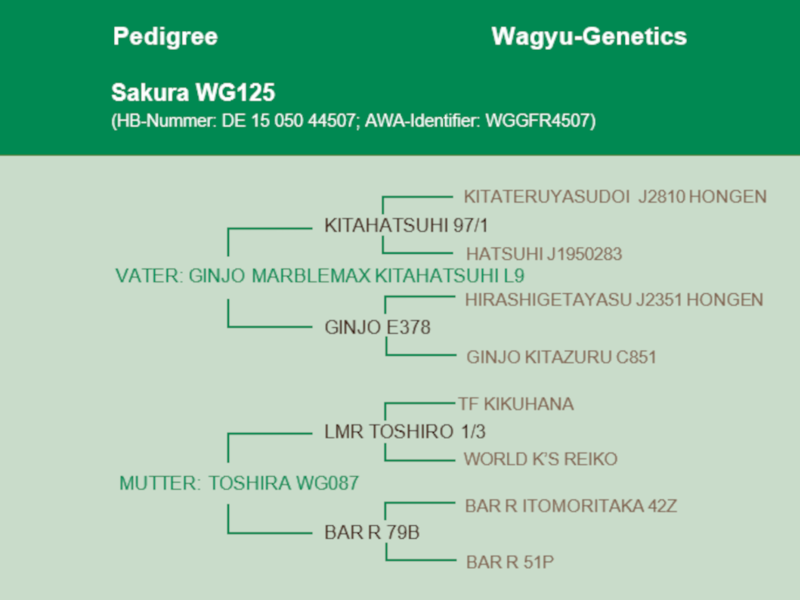 Der Vater ist Bay Dai 7 Hero, der liniengezüchtet worden ist auf Dai 7 Itozakura. Dieser Bulle ist in vielen herausragenden Nachkommen zu finden - Kitaguni Jr., Kitateruyasudoi, Terutani, Itohana - um nur einige zu nennen. Ein Allround-Tier, das zu vielen verschiedenen Bullen passt!