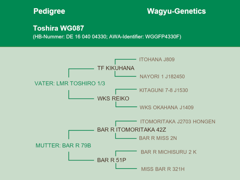 Toshira WG087 hat ein besonderes Pedigree vorzuweisen. Sie hat nur 36,5% Tajima-Blut - dafür Kedaka/Tottori 21%, Itozakura 25% und Shimane 8%. Sie stammt von dem Bullen LMR Toshiro 1/3 ab, der auf Dai 7 Itozakura liniengezüchtet wurde und die sehr seltene WKS Okahana im Pedigree hat.