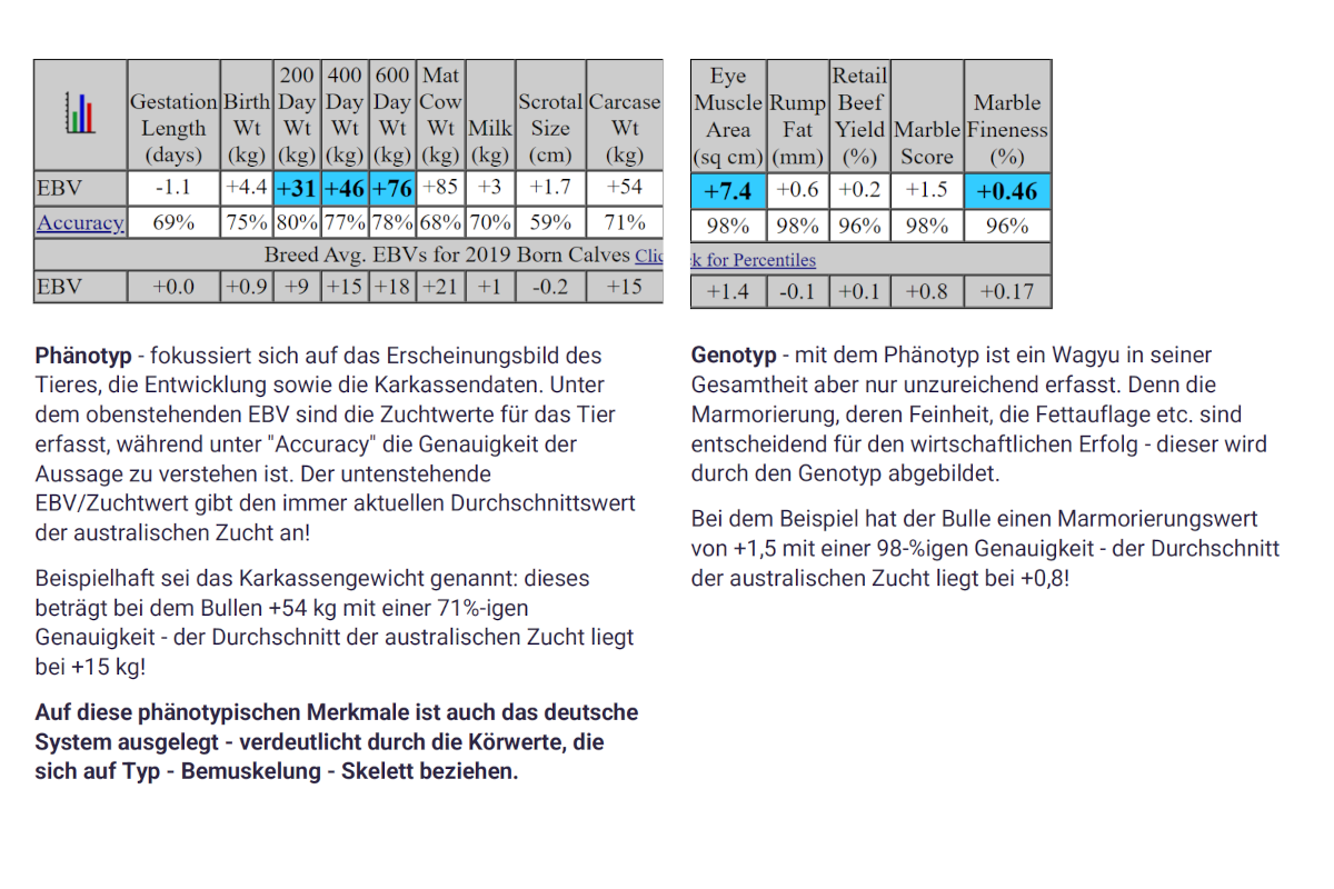 Für den wirtschaftlichen Erfolg mit Wagyu ist es auch heute noch wichtig, verlässliche und damit auch bis zu einem gewissen Grad vorhersagbare Ergebnisse zu erzielen. Dabei spielen die genetischen Eigenschaften eine wichtige Rolle - mindestens genauso wichtig ist aber auch die richtige Fütterung. Sind die gewünschten genetischen Eigenschaften jedoch nicht wirklich vorhanden, lässt sich durch die Fütterung kaum eine Korrektur vornehmen. Umgekehrt kann man natürlich die besten genetischen Voraussetzungen durch eine falsche Fütterung zunichte machen.