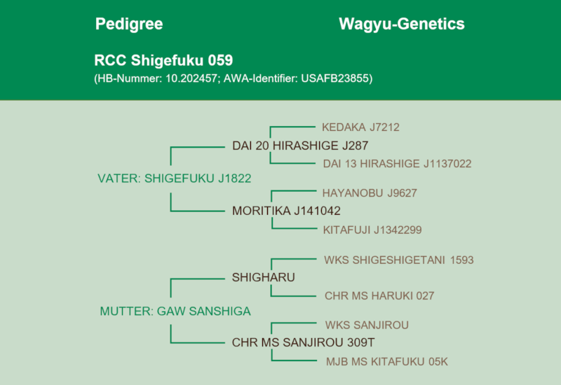 RCC Shigefuku 059 is directly descended from Shigefuku J1822, the bull with the highest percentage of kedaka outside Japan. Only semen was exported from Shigefuku J1822. He is a son of Dai 20 Hirashige 287 and a half-brother of one of the best bulls in Japan - Hirashigekatsu. Hirashigekatsu produces heavy carcasses with extreme marbling. Throughout the Japan Zenkyo competition, six of the top ten bulls were sired by Hirashigekatsu.