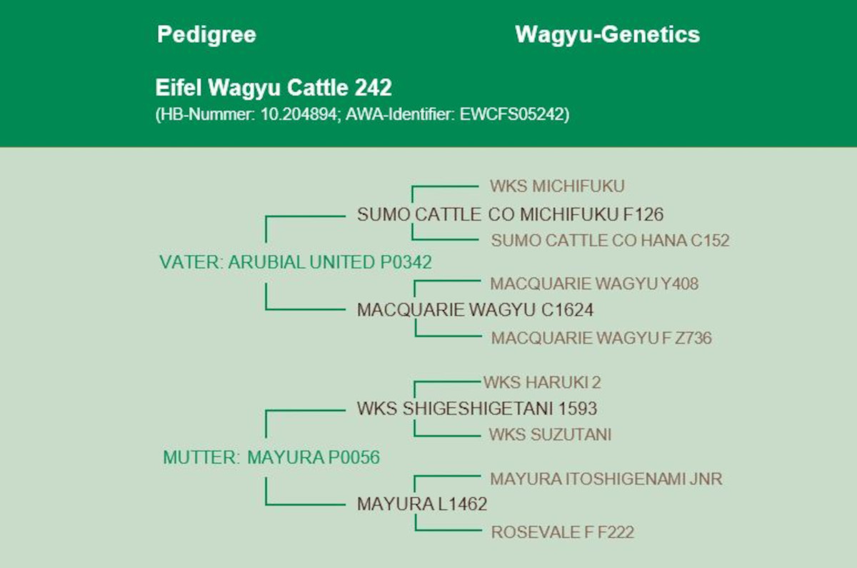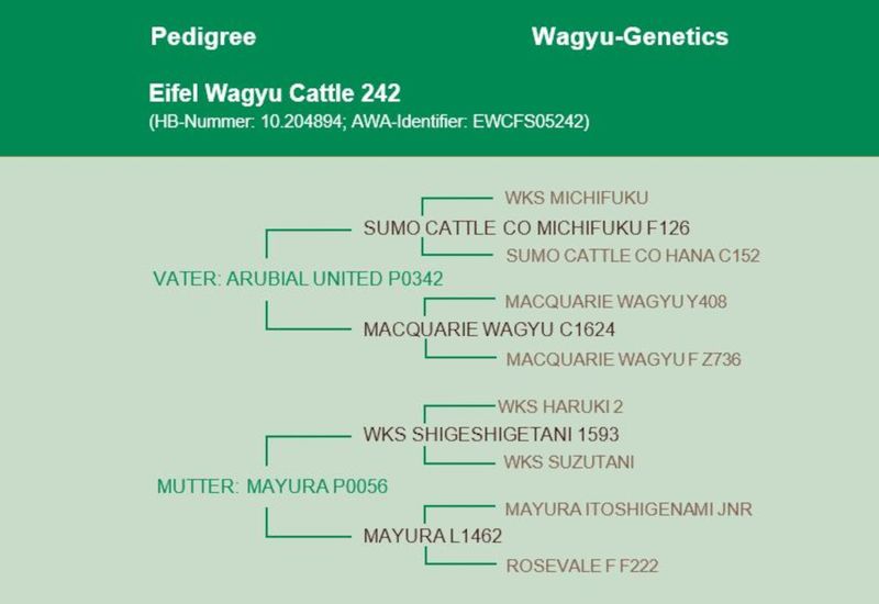 EWC United 242 ist der 7/8-Bruder von T-Rex – und damit ebenfalls ein Sohn des herausragenden Arubial United P0342. Dem steht dieser Bulle von Eifel Wagyu aber praktisch kaum nach – er hat zwar etwas weniger Gewicht als sein berühmter Vater – dafür sind die genomischen Zuchtwerte für RibEye und Marmorierung sogar besser.