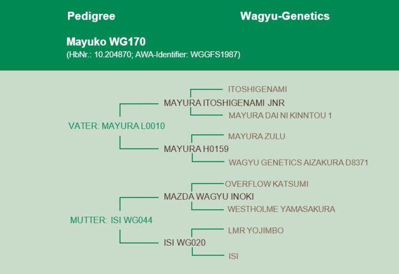 Mayuko WG170 hat durchweg Top-Merkmale in den einzelnen Kategorien – er hat Milch, Gewicht, ein schönes RibEye sowie eine weit über dem Durchschnitt liegende Marmorierung sowie deren Feinheit (siehe Bild).