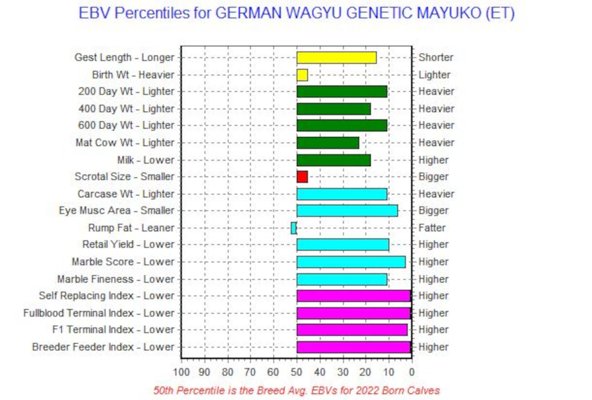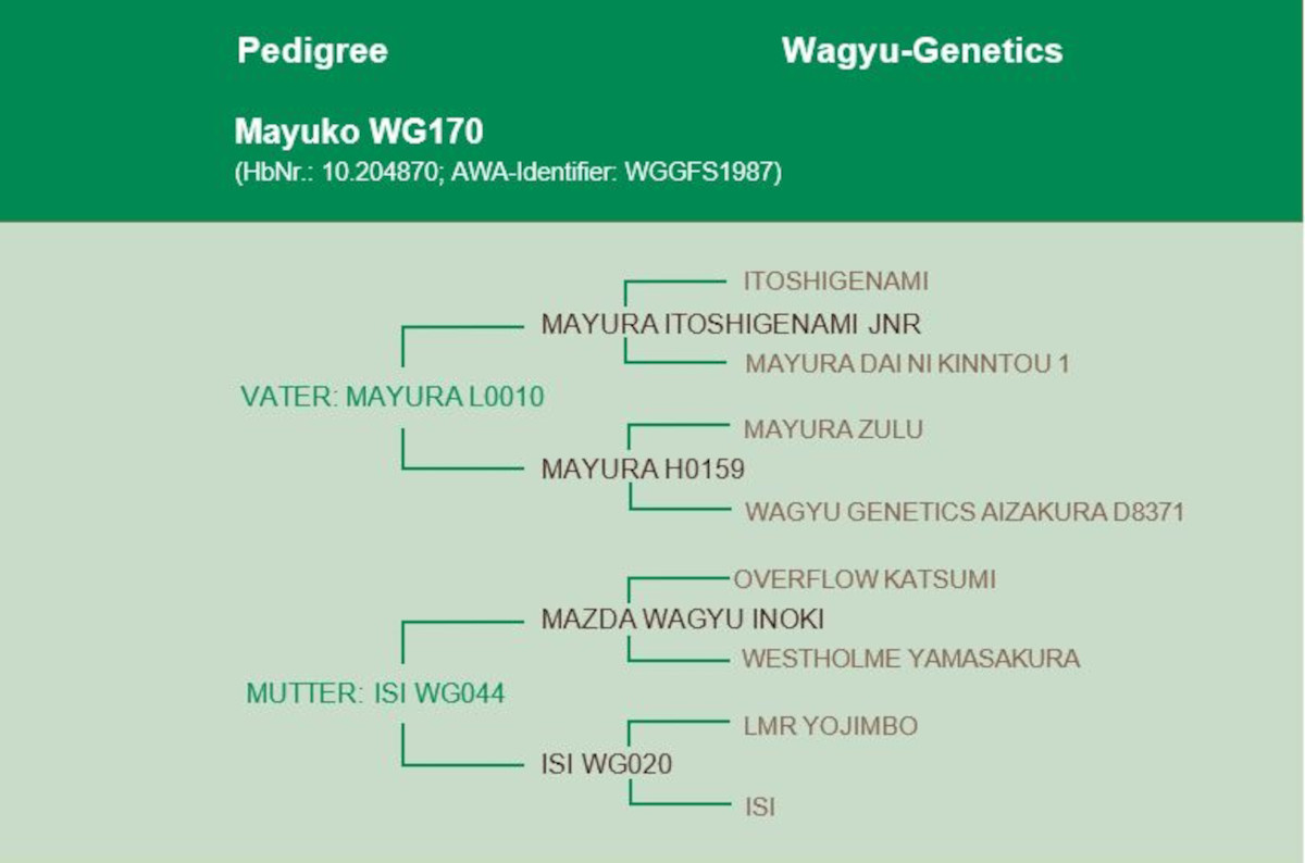 Mayuko WG170 ist ein Top-Allrounder, der bei BFI und SRI konstant im 1% Bereich der australischen Herdbuchzucht liegt. Er ist ein direkter Sohn des Top-Vererbers Mayura L0010, der Milch, Gewicht, Marmorierung und RibEye mitbringt. Auf der Mutterseite kommt Isi WG044 in das Pedigree, die fertilste Kuh aus unserer Herde.
