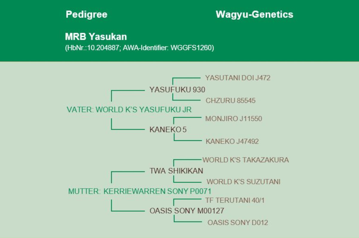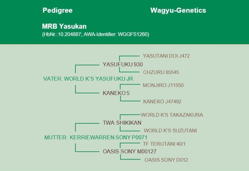 Er ist ein direkter Sohn von Yasufuku Jr., der wiederum von Jasufuku J930 abstammt – einem in Japan aufgrund der Marmorierung sehr häufig eingesetzten Bullen. Jasufuku Jr. hat ein herausragendes RibEye und eine Top-Marmorierung – beide Werte sind aufgrund der vielen Nachkommen bestätigt! Auf der Mutterseite von MRB Yasukan ist TWA Shikikan zu finden, der direkt von World K’s Takazakura und World K’s Suzutani abstammt. Auf unserer letzten Australien-Reise ist uns dieser Bulle für seine hervorragend feine Marmorierung genannt worden. Weiter hinten im Pedigree finden sich Terutani 40/1 sowie Itozurudoi!