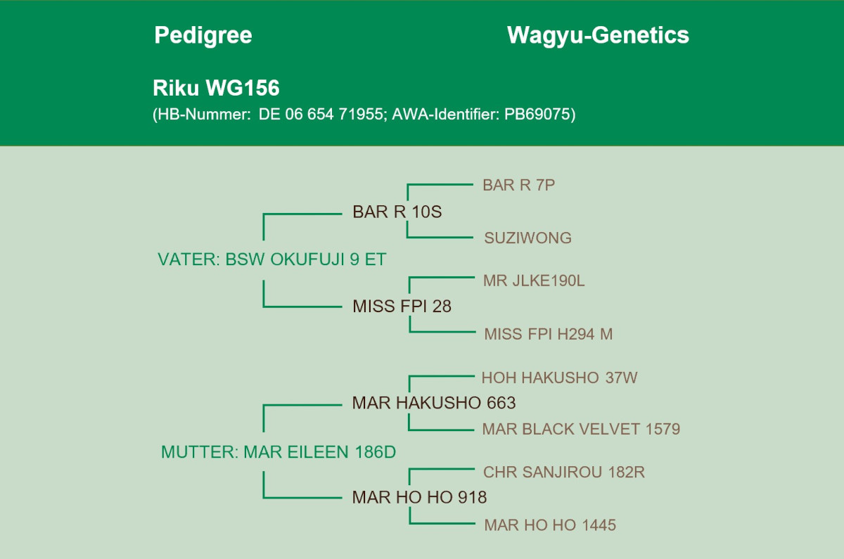 Sein Vater ist der Gewinner Wagyu Purebred bei der 2018 National Stock Show in Denver - dies lässt den Rückschluss auf ein gutes Exterieur auch bei Riku WG156 zu. In seinem Pedigree finden sich zudem so bekannte Vererber wie Sanjirou, Kenhanafuji, Haruki 2 und Suzutani!