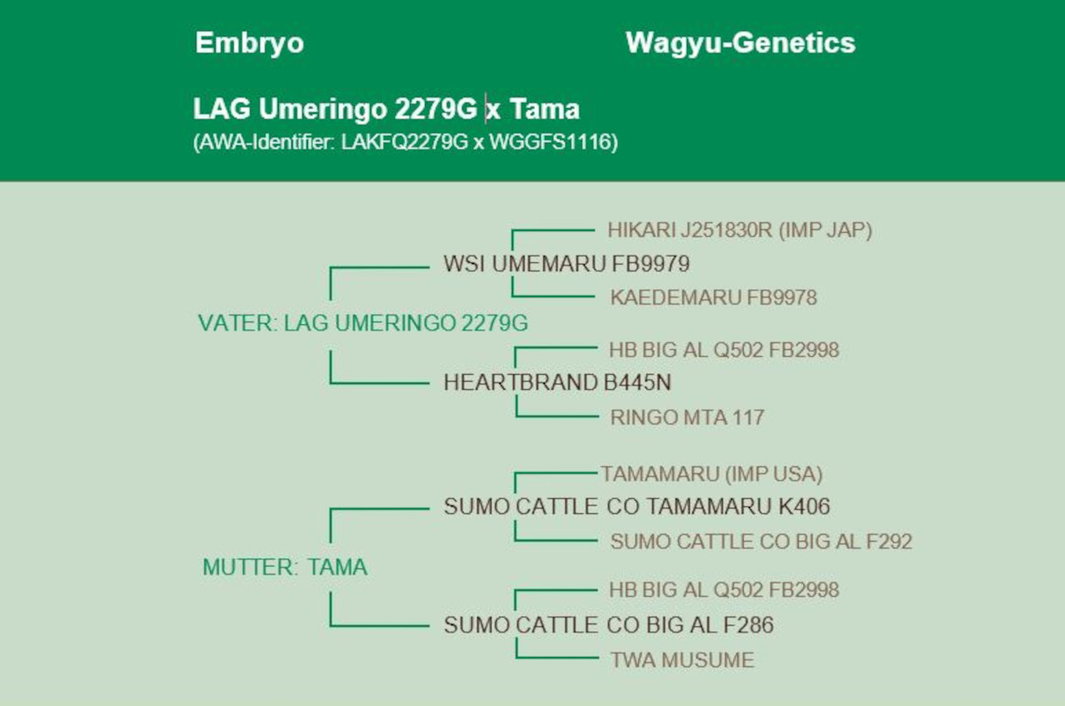LAG Umeringo comes directly from the heart of the “Legendary Akaushi” breeding program in the USA. He has the outstanding Akaushi bull Dai 10 Mitsumaru three times in his pedigree – via the bulls Hikari and Big Al and the outstanding cow Kaedemaru. On his dam's side, Ringo also appears in the pedigree, who is descended from the legendary Japanese cow Dai 8 Marunami.