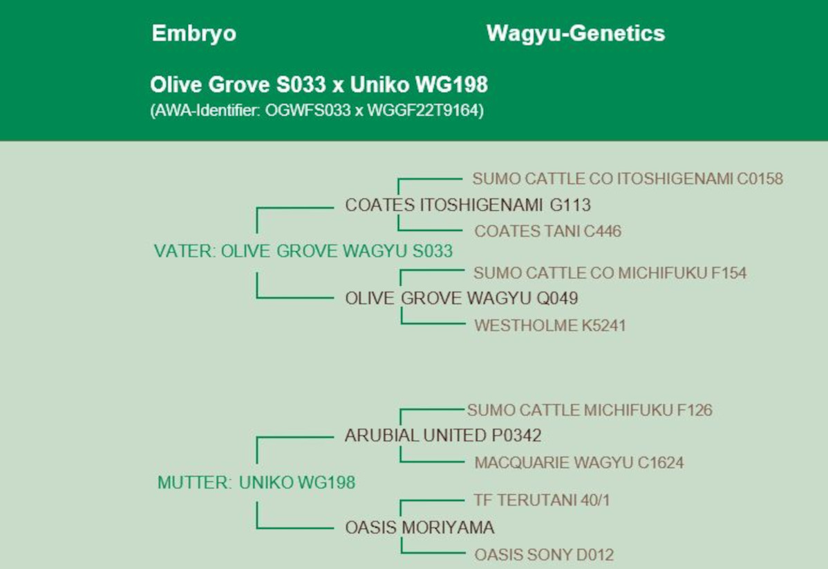 The dam Uniko is sired by Arubial United 342, one of the top performers of recent years. On her dam's side, she has Terutani and Itozurudoi – both bulls known for their size. Uniko is also the dam of WGG Itoko, one of the best genetic defect-free heifers worldwide.