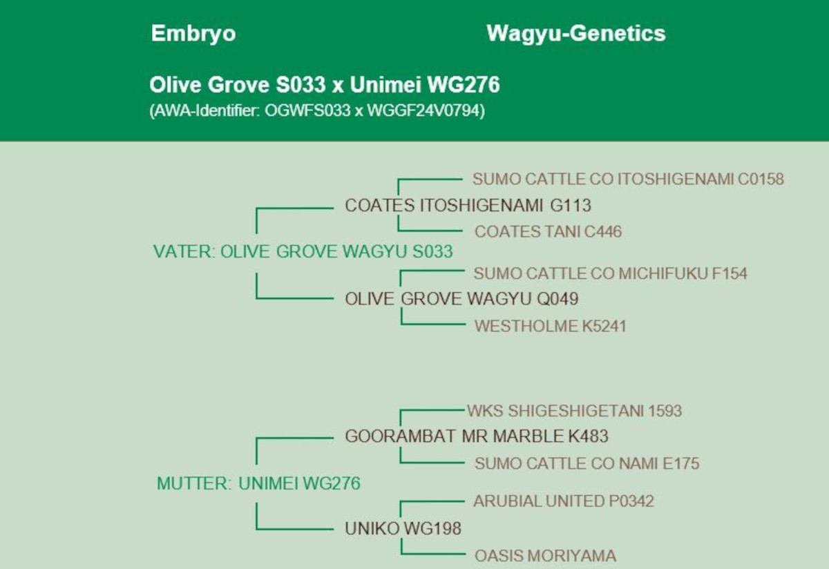 The sire is a direct son of Coates Itoshigenami G113 – another top bull from Australia. On the dam's side, Sumo Cattle Michifuku 154 and old Westholme genetics are added to the pedigree. S033 is a top combination of marbling and marbling fineness (both values in the top 1% range) as well as a well above-average weight!